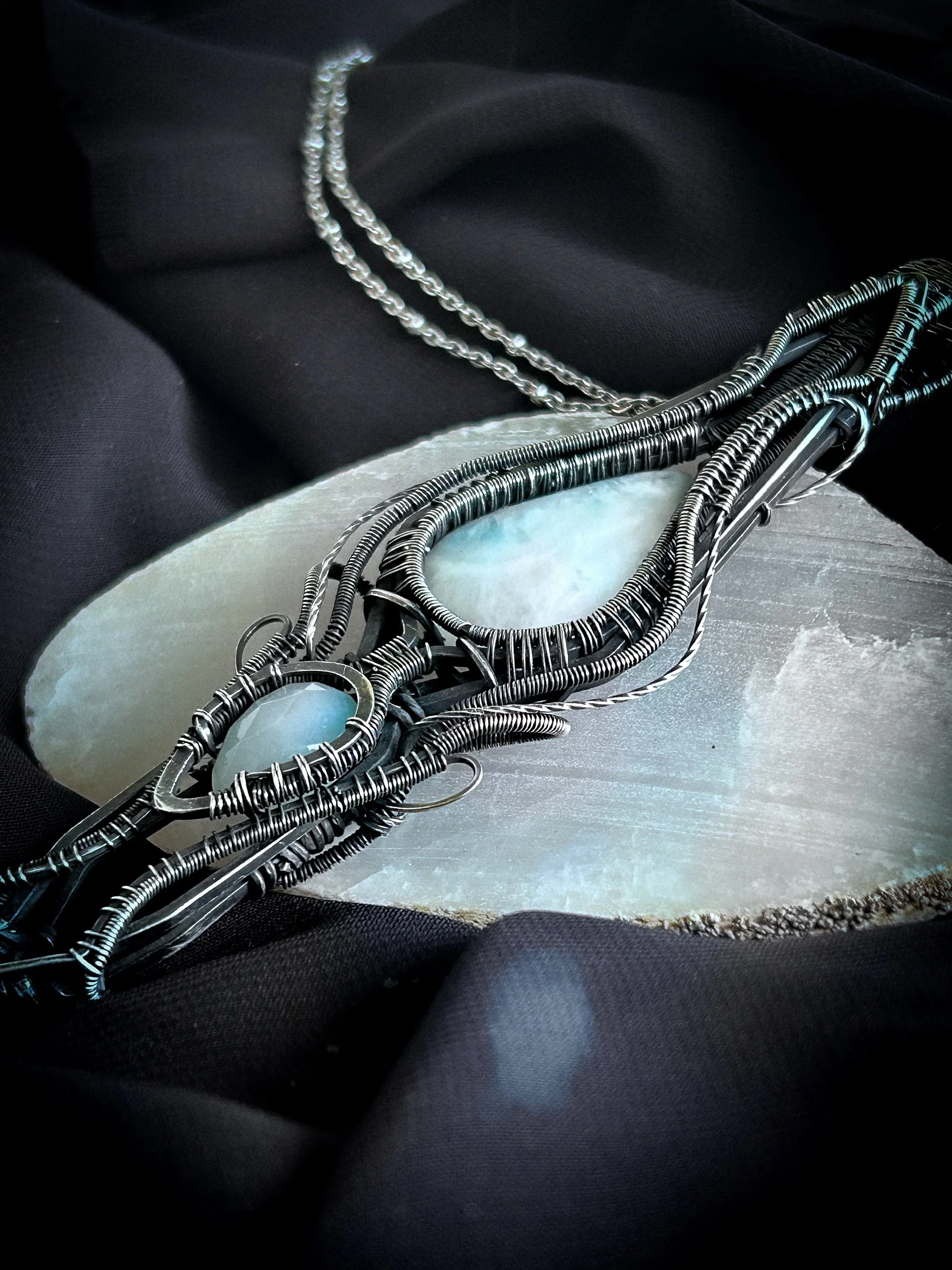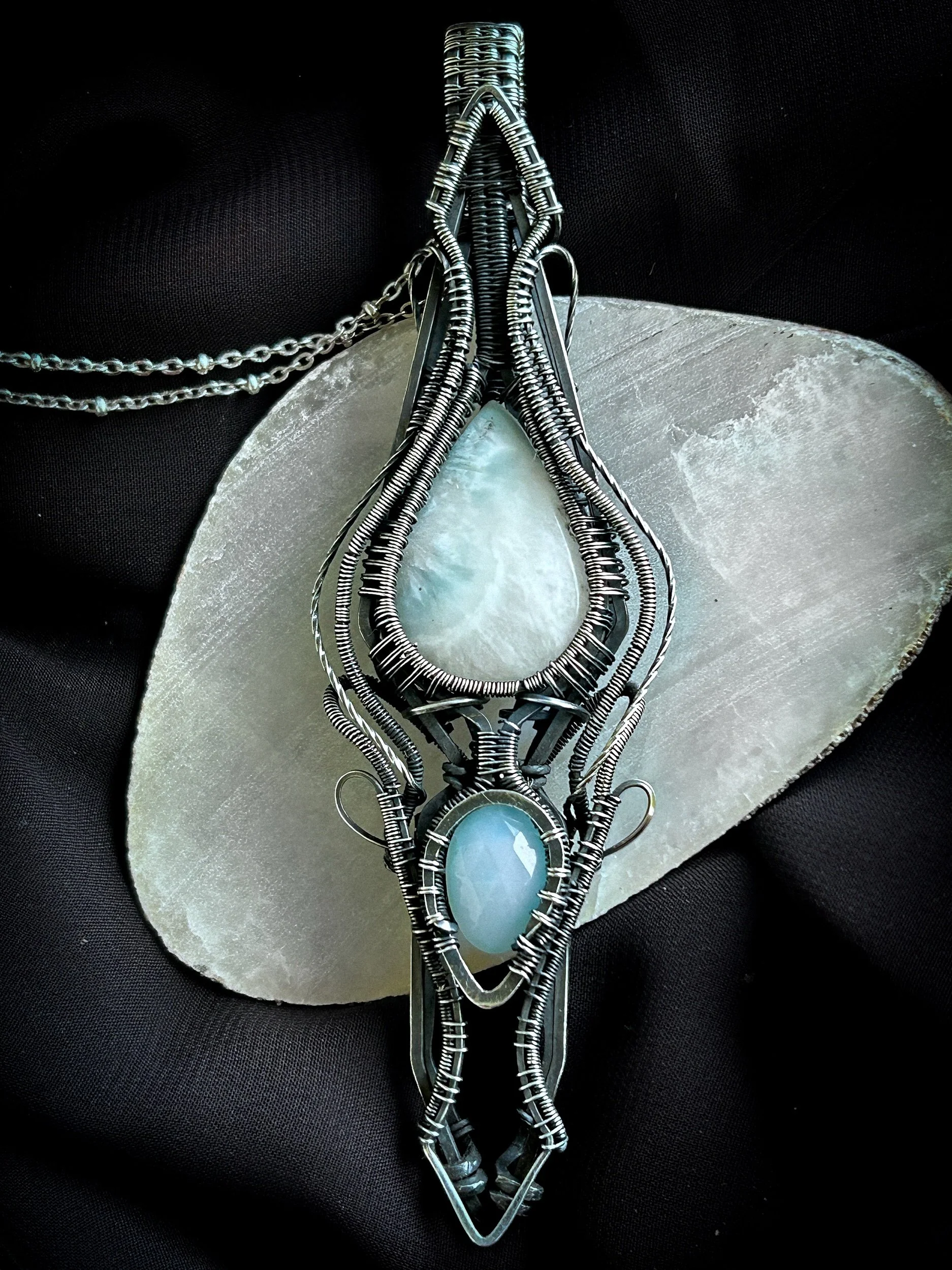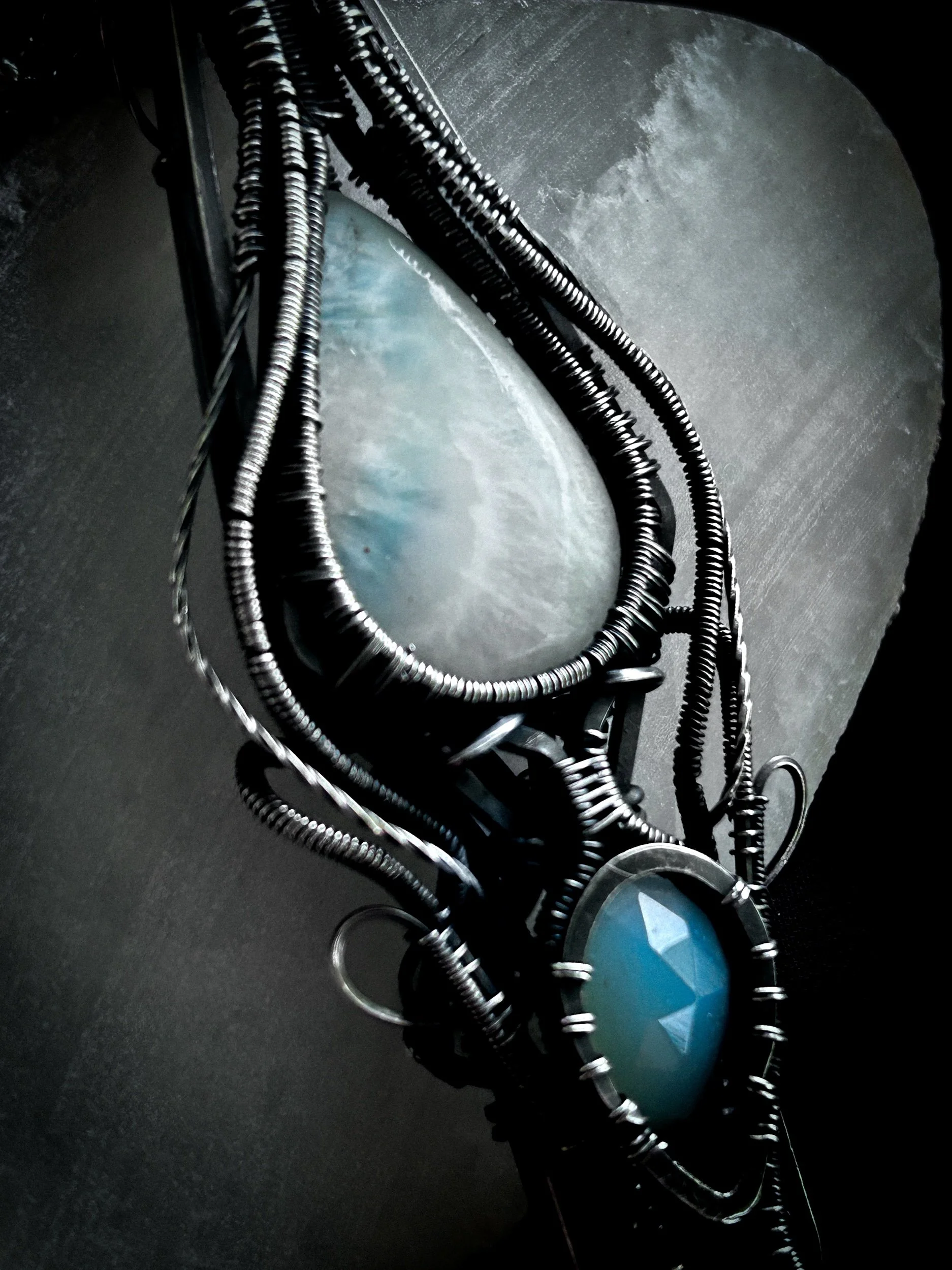 Larimar & Paraiba Onyx Accent Wire Wrapped Pendant, Sterling Silver